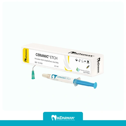 ژل اسید اچ پرسلن CERANIC ETCH هیدروفلوئوریک 9% برای اچ کردن سطح روکش های شکسته پرسلن در داخل دهان می باشد و همچنین محصول برای اچینگ پرسلن ونیر، اینله، آنله، کراون و براکت های ارتودونسی قبل از باندینگ کاربرد دارد.